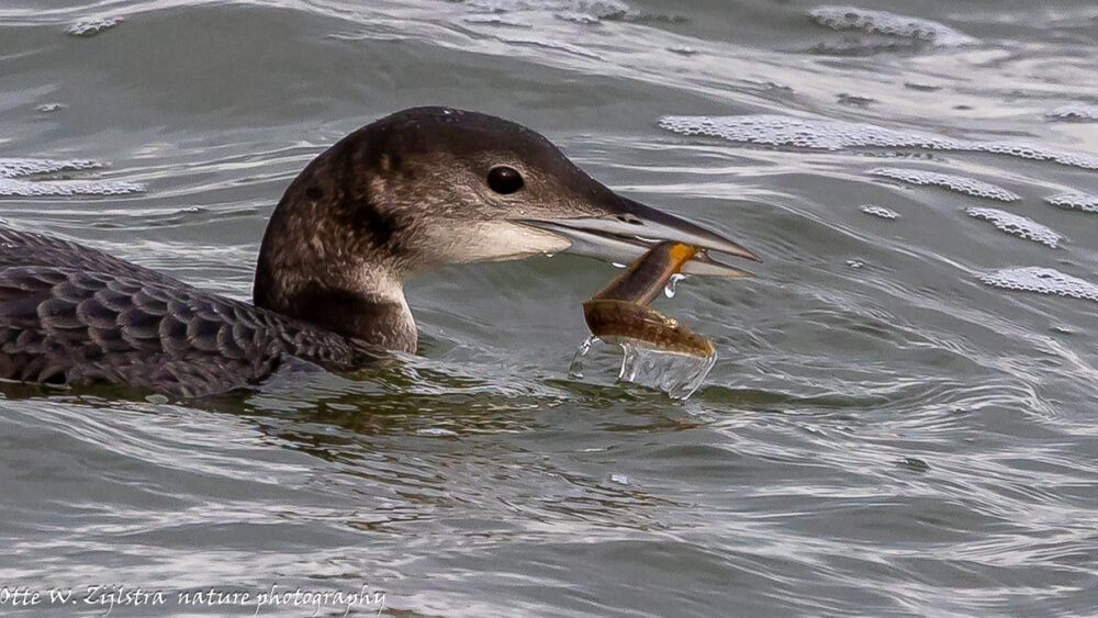Met mijn trouwe groepje naar de zuidpier van IJmuiden geweest, harde wind trotserend. De pier was afgesloten maar in het eerste stukje vonden we de IJsduiker met een glibberig botervisje die hij behendig opdook. Eerst dobberde hij veraf tussen de pieren maar kwam langzamerhand dichterbij. Gelukkig hadden we even de tijd om een paar leuke plaatsjes te schieten. Het botervisje, die geen economische waarde heeft, was ongeveer 10 cm lang. Aan hun glibberige uiterlijk hebben ze hun naam te danken.