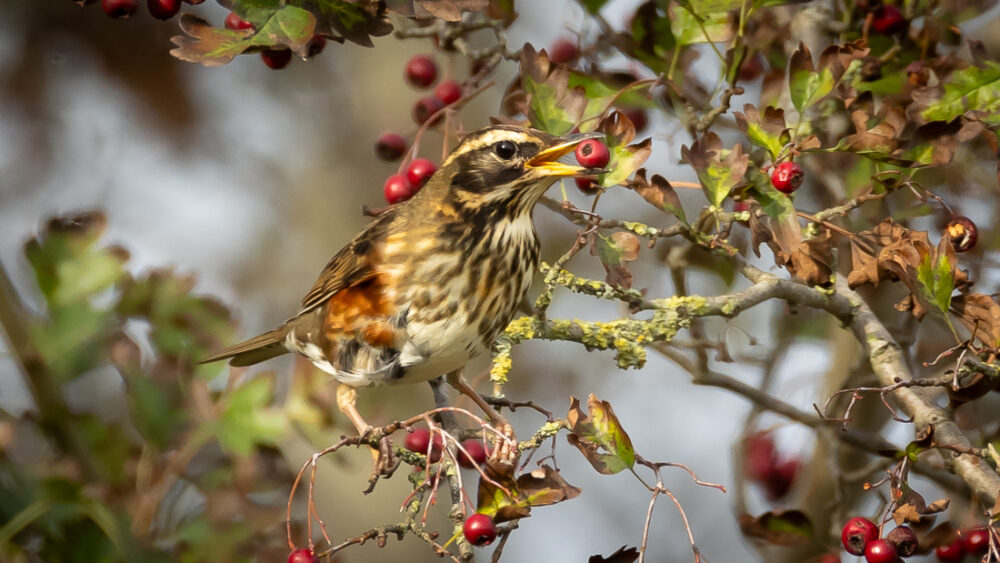 De temperaturen zakken in het noorden en er valt veel sneeuw, dus komen de wintergasten afzakken naar het zuiden en dus ook bij ons. Dat geldt zeker voor de koperwieken en ook voor de Kramsvogel. Hier vallen ze in op de besdragende struiken zoals de meidoorn. Dat de Engelsen hem Redwing noemen zal nu duidelijk zijn!