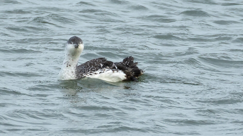 Halverwege de Afsluitdijk vond ik een Roodkeelduiker na getipt te zijn door een vriendelijk man uit Groningen. Ik was al in Den Oever dus ik was snel t.p. en vond hem ook snel aan de Wadkant bij Breezanddijk. Natuurlijk niet zo mooi kleurrijk als in het zomerkleed, maar toch een prachtig beest en goed aangepast om vissen te vangen: ligt laag op het water en de poten ver naar achteren geplaatst. Had een klein olievlekje op de borst en hopelijk wordt hem dat niet noodlottig. Was flink actief.