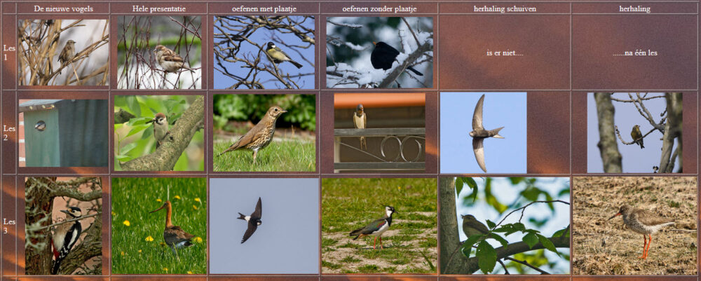 U ziet in het dit plaatje hoe de online lessen er uit zien. Klik op een vogeltje en dat deel van de cursus wat er aan gelinkt is gaat open.