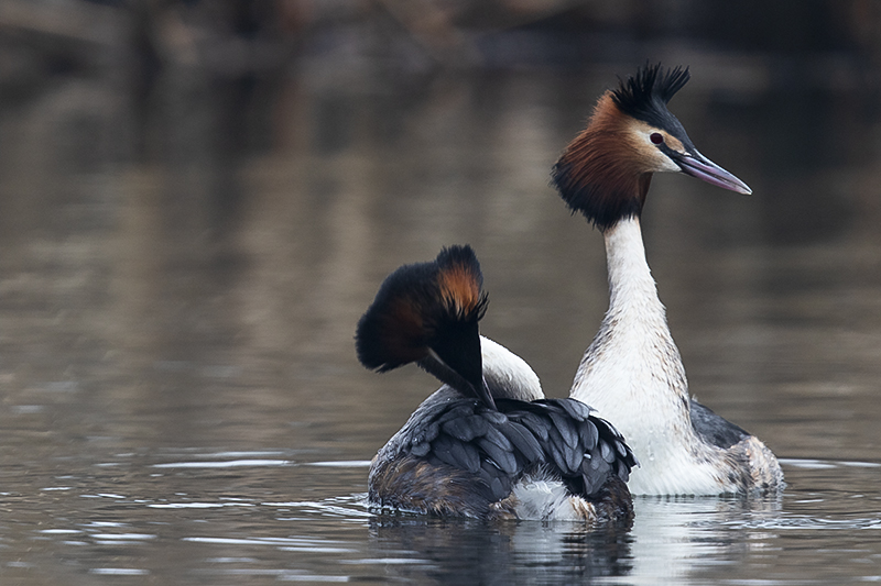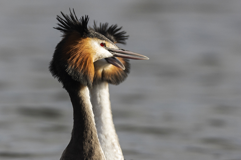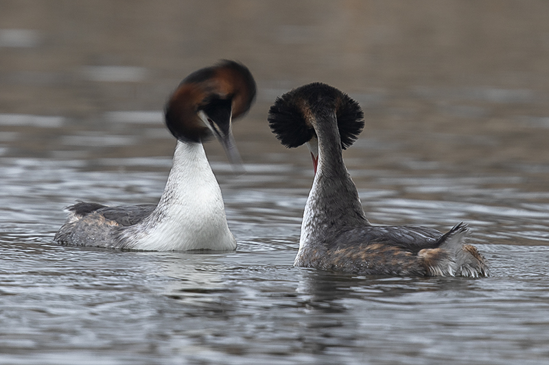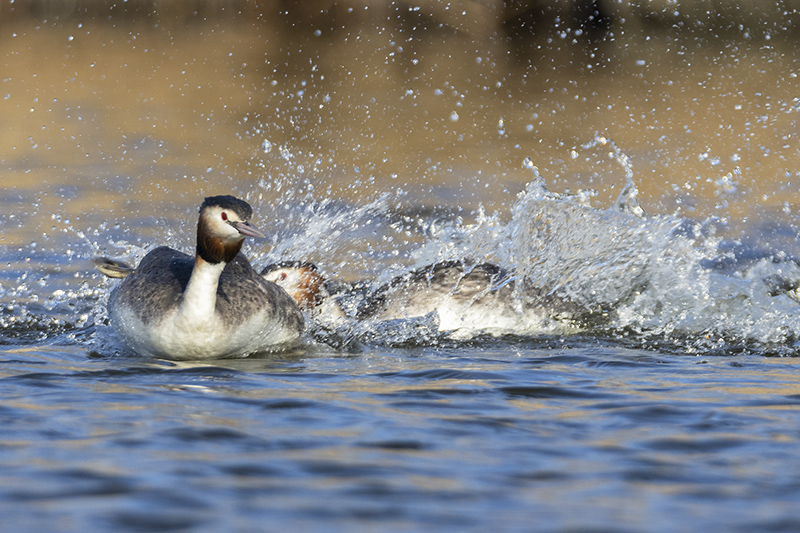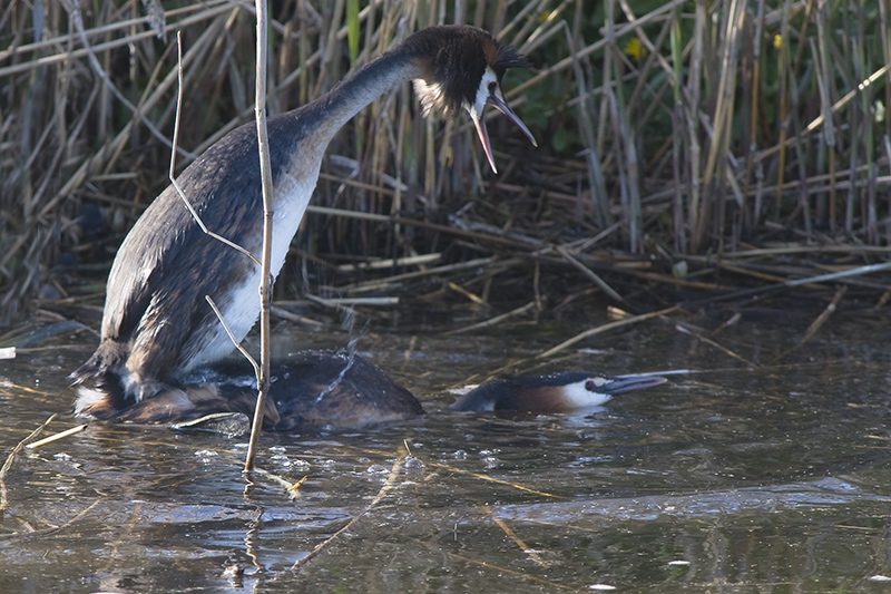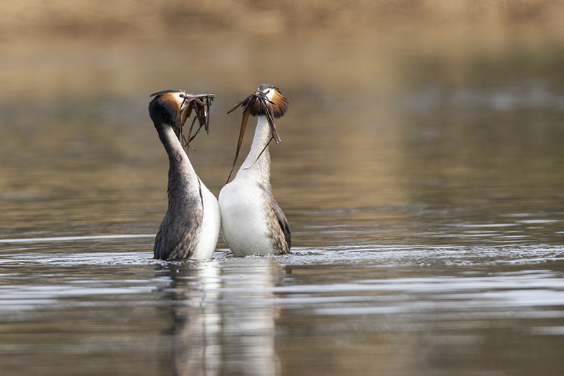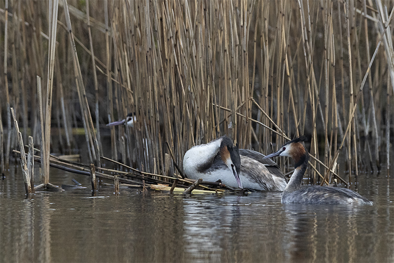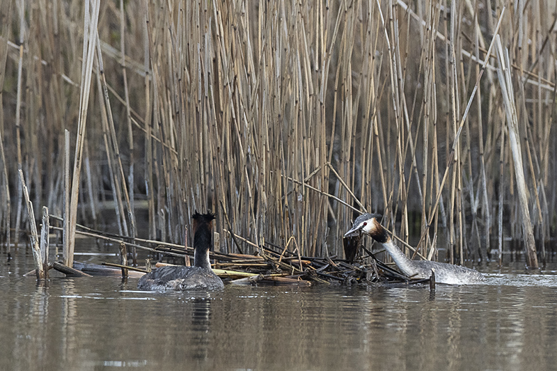 We zijn midden maart al gepasseerd, de lente kondigt zich op alle fronten aan. Zo ook in de vogelwereld. Diverse zomergasten keren terug of zijn al teruggekeerd uit hun winterverblijf en laten van zich horen om een territorium te claimen of een partner te lokken. Andere vogels zijn al een stap verder en zijn druk aan het baltsen. Bijvoorbeeld de fuut. Hoewel in deze periode van het jaar nog niet elke fuut in volledig prachtkleed is weerhoudt dat hen niet om een potentiële partner ervan te overtuigen dat hij/zij de beste keus is. Op een plaats waar meerdere stelletjes futen aanwezig zijn wordt er een waar theaterstuk ten tonele gebracht. De mannetjes doen hun uiterste best om een leuke vrouw te versieren. Dit doen ze door opvallend rond te zwemmen in hun zojuist geclaimde territorium. Futen zijn buiten de broedtijd redelijk zwijgzaam maar nu laten ze zich horen. Een krachtig rollend “geknor”. Vervolgens worden er diverse rituelen uitgevoerd door het zojuist gevormde paar. Het synchroon kopschudden, het admiraalzeilen, en vervolgens de pinguïndans. Als dit laatste wordt uitgevoerd laten beide partners zich onder water zakken om daarna met plantresten in hun bek weer boven water te komen. Ze komen “watertrappelend “ uit het water, steeds hoger waarbij ze elkaar in de ogen blijven kijken. Daarna zakken ze terug het kopschudden volhoudend. Daarna kan de paring plaatsvinden. Het territorium wordt flink verdedigd, indringers wordt duidelijk gemaakt dat ze moeten ophoepelen. Dit door middel van dreighoudingen maar er wordt soms ook flink gevochten als de indringer niet op het dreigen reageert.