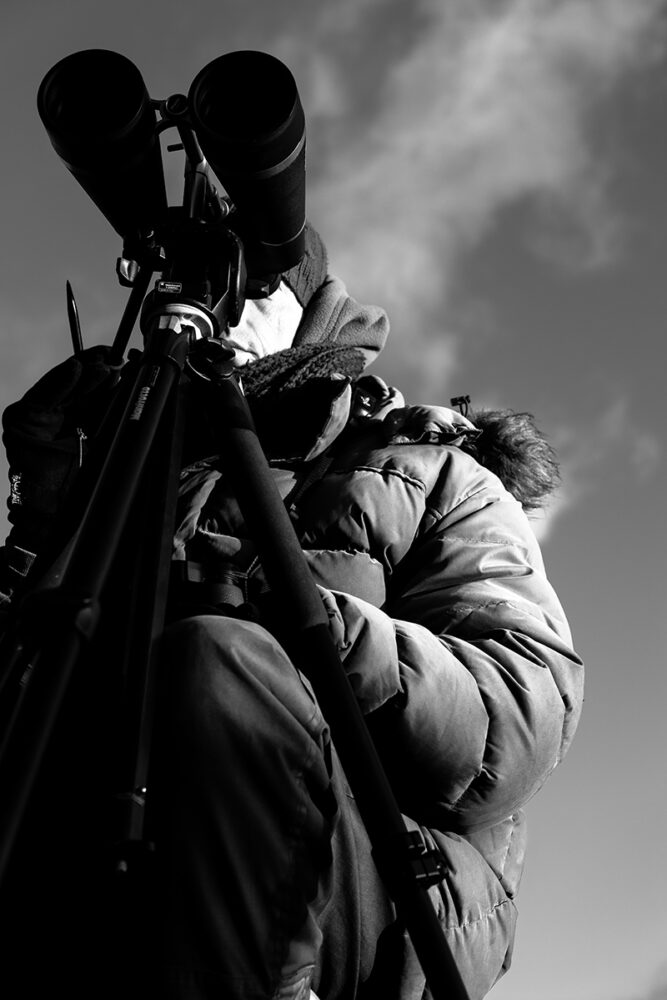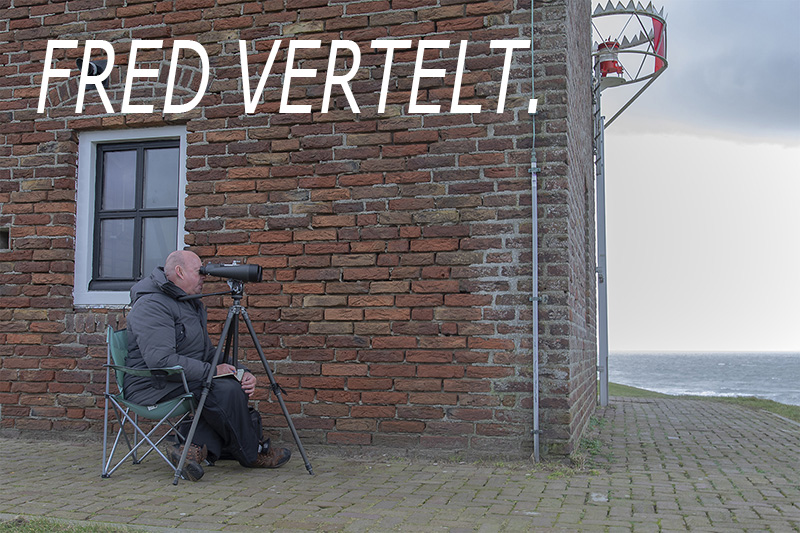 Al heel vroeg in het jaar zit Fred Geldermans bij het‘Torentje’ op dijk. Afhankelijk vanwaar de wind vandaan komt zit hij er links, rechts of juist voor, dik ingepakt en de speciale verrekijker bij de hand. Naast hem ligt een boekje waarin exact wordt bijgehouden wat er voorbij vliegt. Ik spreek hem tijdens de hond uitlaten meestal even aan want nieuwsgierig als ik ben, wil ik graag weten wat hij zoal ziet vliegen in de verte, of zwemmen, want ook de bruinvissen heeft hij al gesignaleerd .