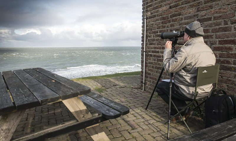 Geen eenvoudige klus voor de zeetrektellers: wat zien ze allemaal op de Bol? Foto: Leo Hofland.