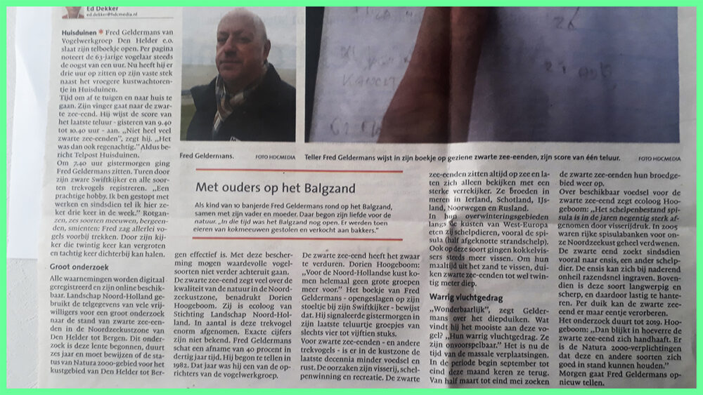 Fred Geldermans. naast Kees Rebel vaste zeetrekteller en ook al jarenlang lid van de Vogelwerkgroep Den Helder – Anna Paulowna en omstreken., dook ook in zijn archieven en vond bewijs voor het feit dat ook hij al heel lang te vinden is in Huisduinen;. twee krantenartikelen uit 2013.